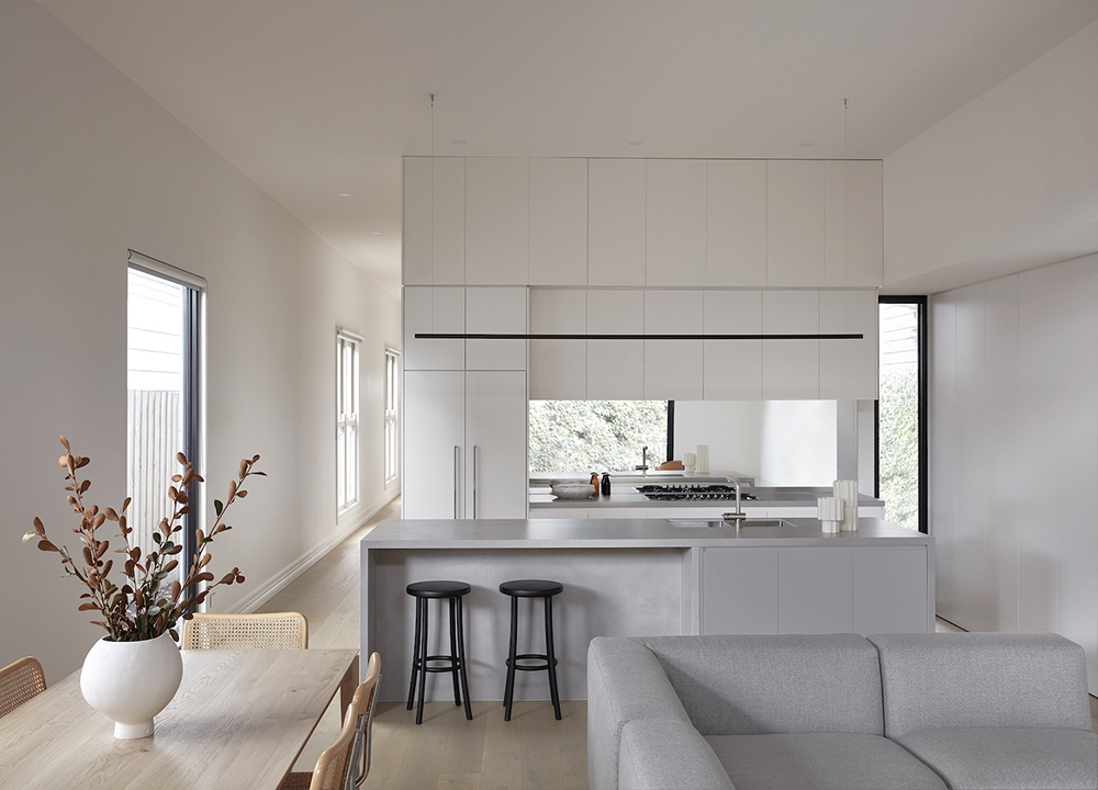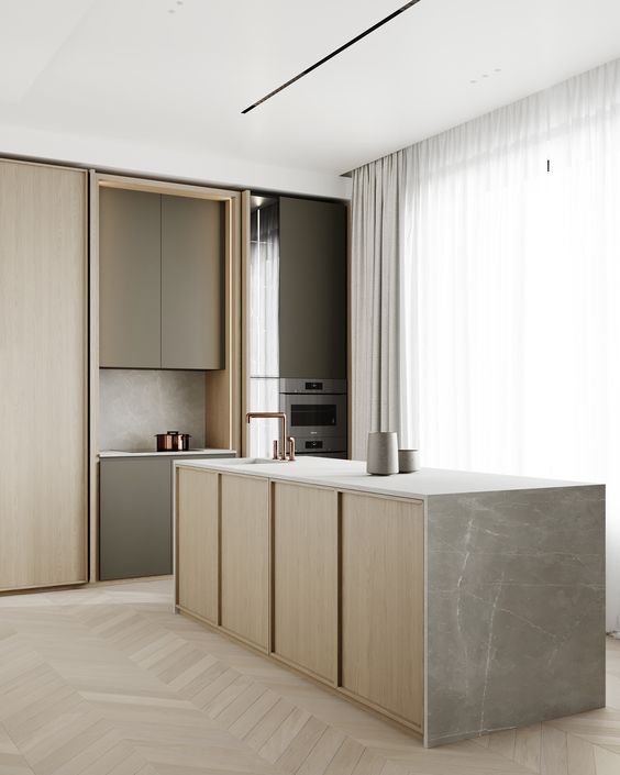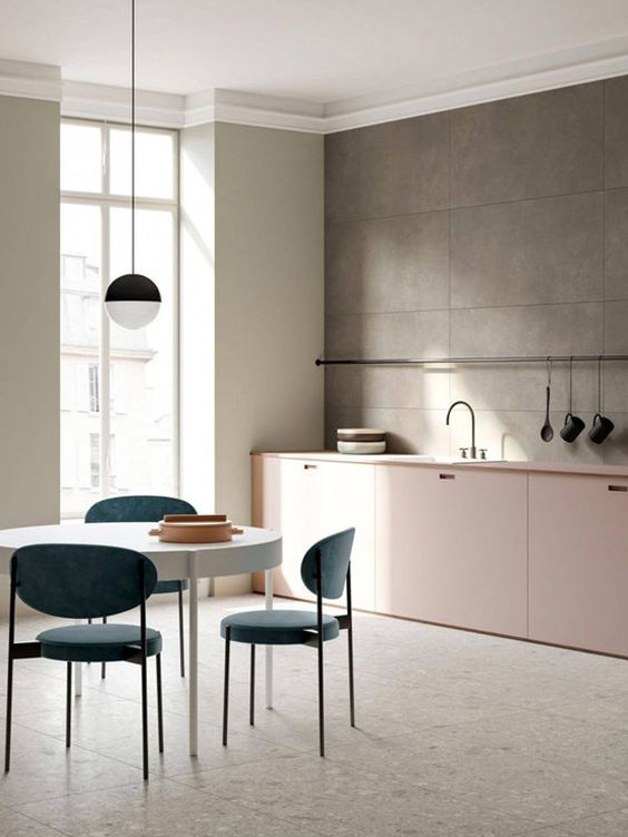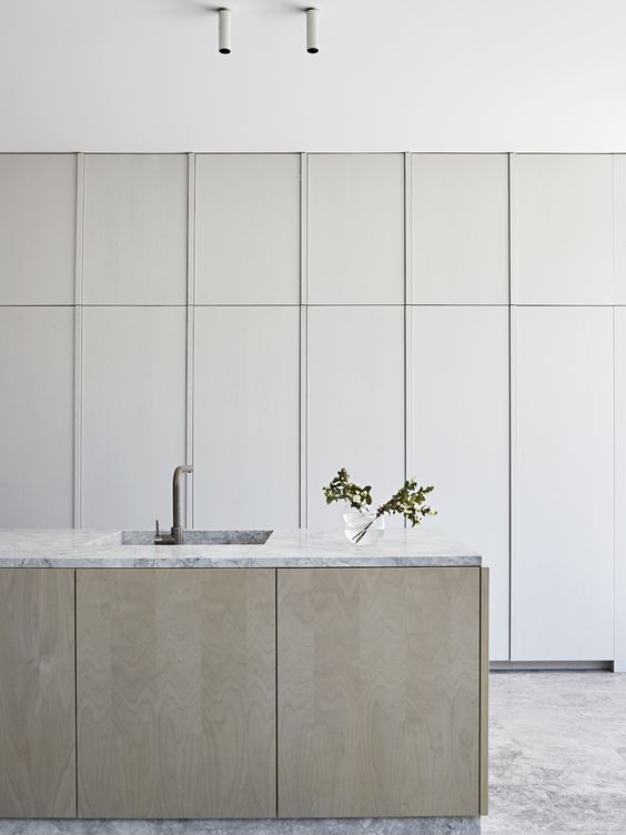 Bucătăria în stil minimalist include un număr minim de obiecte, iar decorul și accesoriile lipsesc. Se vor folosi linii drepte și obiecte de uz casnic care vor fi ascunse. Aici nu își au locul lucrurile mici de suflet cum ar fi bibelourile sau ramele foto. Mobilierul este bine să vină în tonuri cât mai apropiate de cea a pereților. Pentru a crea senzația de spațiu extins, partea de jos a mobilierului va fi în culori închise, iar cea de sus în culori deschise. Mânerele vor fi ascunse, iar texturile cât mai netede.