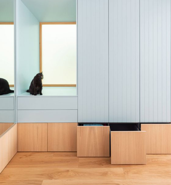 Mobilierul trebuie să fie cât mai simplu cu forme drepte, de exemplu: patul poate fi fără tăblie și poziționat pe un podium, sub care se va depozita lenjeria și alte lucruri. Noptierele vor fi cât mai simple și simetric poziționate față de pat. Pentru depozitare optați pentru un dressing, ideal – încorporat în perete.