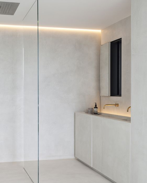 BAIA să fie cât mai spațioasă. Finisajul ideal pentru pereți și pardoseală este piatra naturală sau plăci ceramice în culori uni. Folosiți cât mai multă sticlă sau finisaj lucios, iar o oglindă mare deasupra chiuvetei este obligatorie.