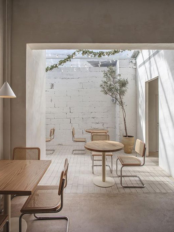 Stilul minimalist în restaurante încorporează palete de culori neutre însoțite de variațiuni de alb, iar mobilierul este delicat, în linii concise, elementele de decor lipsind aproape în totalitate.