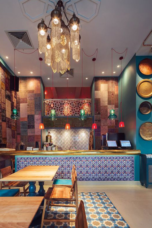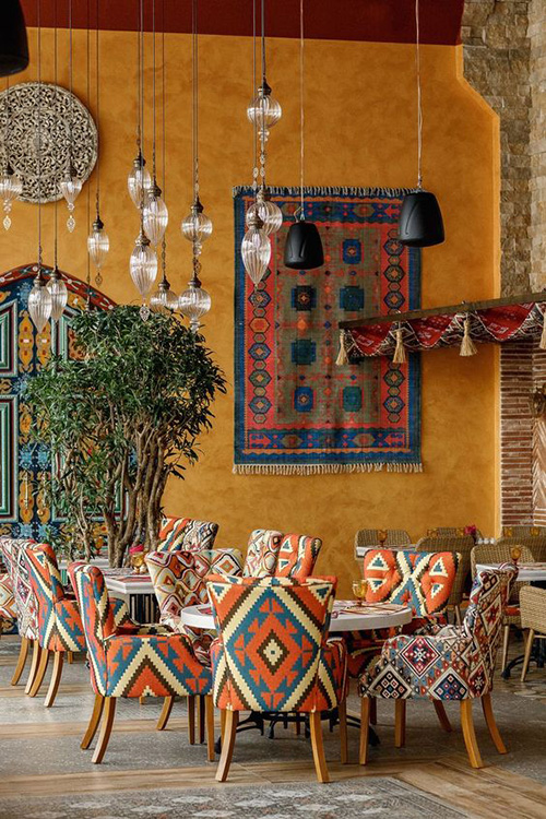 Frecvența pernelor decorative, posibilitatea de a lua masa pe jos, în absența canapelelor, fuziunile de culori calde (roz, portocaliu, roșu, galben), toate acestea creează un peisaj inedit, trecând dincolo de ideea de masă în oraș: restaurantele orientale sunt o experiență.